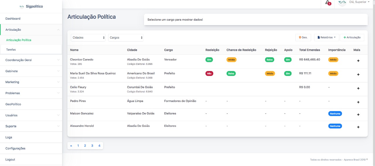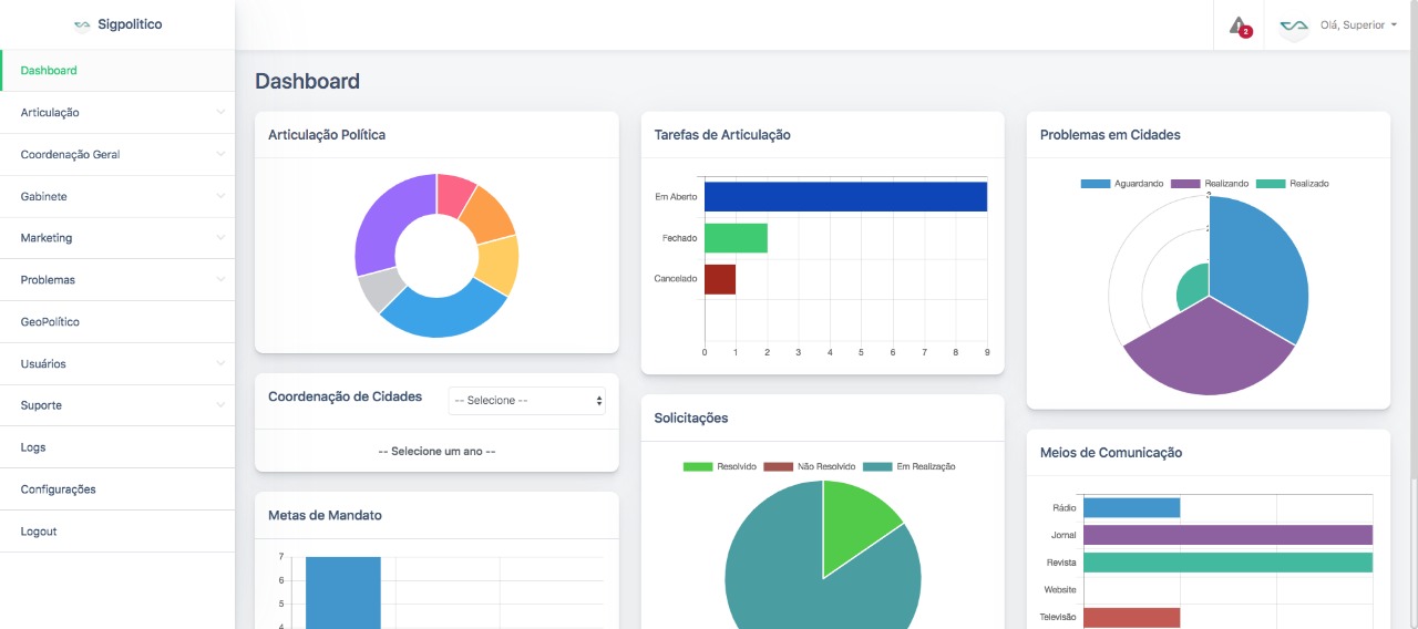 Funcao que permite ao parlamentar manter controle de informacoes e metas essenciais ao seu mandato, bem como o controle de toda sua equipe cadastrada no sistema.