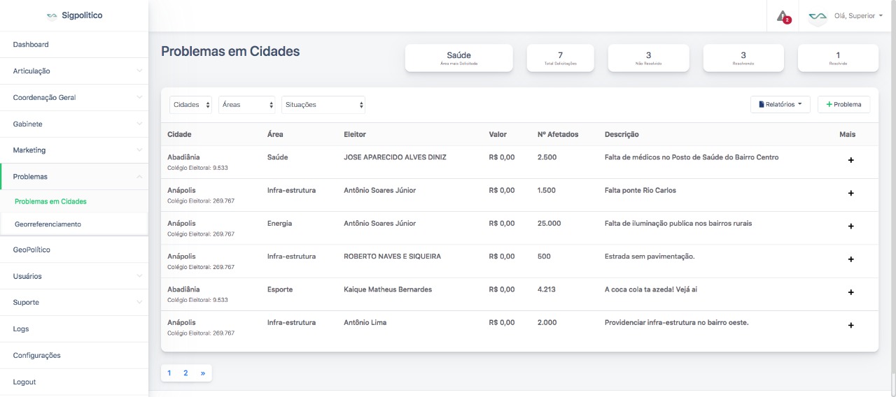 Ferramenta do sistema que permite a interação da população e aliados com o parlamentar. O sistema possibilita ao usuário cadastrar todas as solicitações recebidas e georreferenciá-las para sua adequada solução.